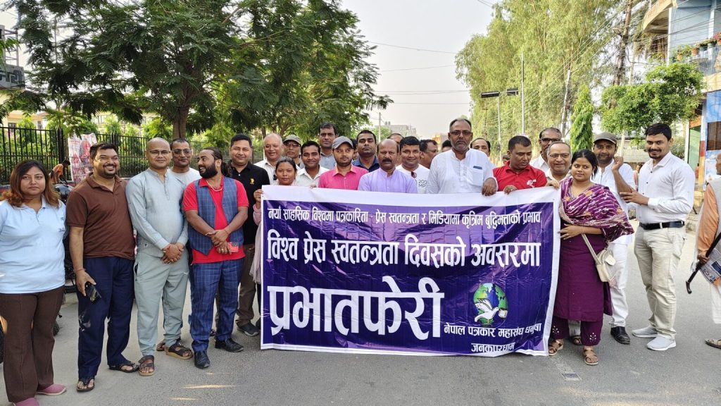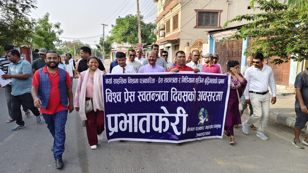 जनकपुरधाम, बैशाख २० : बिश्व प्रेस स्वतन्त्रता दिवसको अवसरमा नेपाल पत्रकार महासंघ धनुषा शाखाले विभिन्न कार्यक्रमहरुको आयोजना गरेको छ । अध्यक्ष पुरन साहको नेतृत्वमा यस अवसरमा शनिवार आयोजित प्रभात फेरी, पत्रकारहरुको निशुल्क स्वास्थ्य परिक्षण तथा रक्तदान जिवनदान कार्यक्रम भब्यतापुर्वक सन्पन्न भएको छ ।