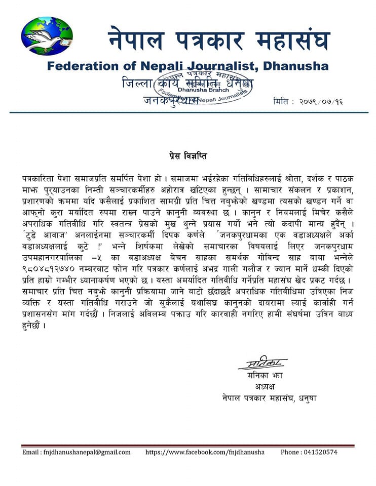 प्रेस विज्ञप्तिपत्रकार दिपक कर्णलाई अभद्र गाली गलौज र ज्यान मार्ने धम्की पत्रकार महासंघ धनुषाNovember 22, 2022March 4, 20242041 Min Read FacebookTwitterLinkedInPinterestStumbleuponEmail Share